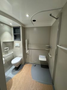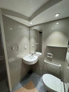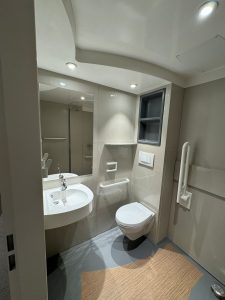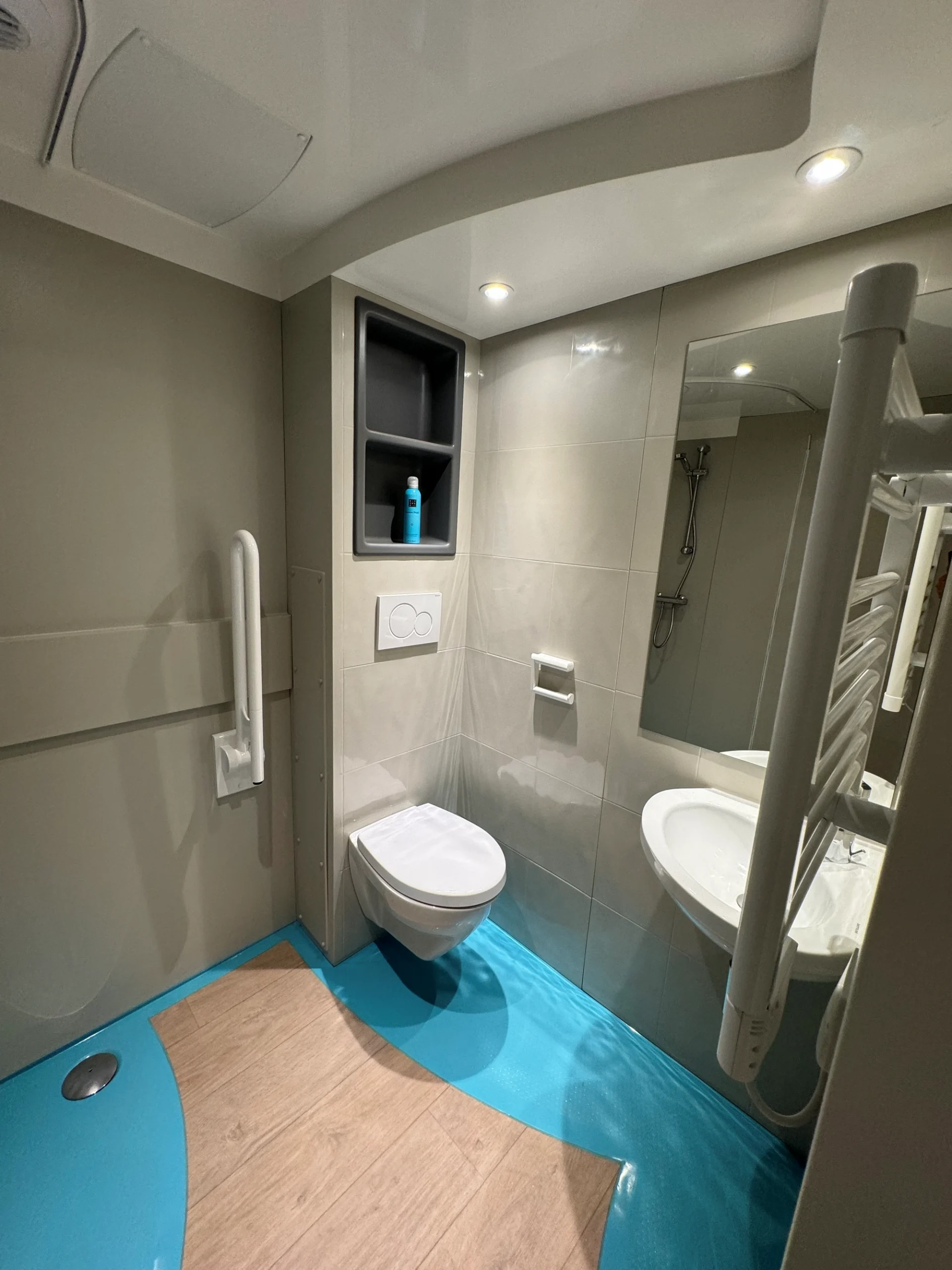 - Compleet ingericht met toegangsdeur, kranen, handdoekhaken, zeepbakje, douchegordijn, wastafel, toiletrolhouder, handgrepen, vrijhangend toilet met zitting, geïntegreerde spoelbak 3/6 liter met dubbele spoelknop, ventilatieklep, en meer