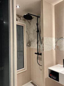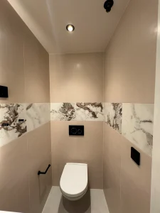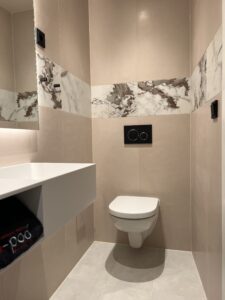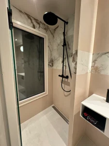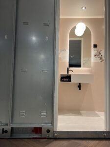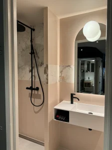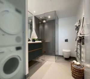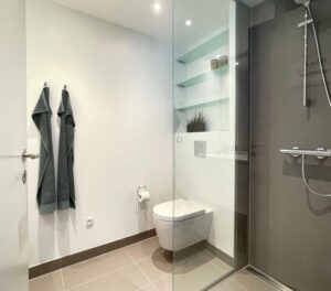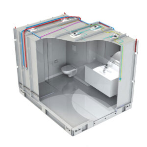 Een strakke, modulaire betegelde badkamer. Op maat gemaakt. Schroefvrije wanden – zonder aanvullende verstevigingen. Modern ontwerp, geschilderde gladde plafonds zonder voegen en schroeven. Wand tot vloer in keramiek. De badkamer kan via de hoeken van het plafond worden opgetild. Voldoet aan brand- en geluidseisen. Digitale kwaliteitsgarantie met volledige transparantie via QR-code. Onbeperkte technische mogelijkheden (ramen, schuine hoeken).