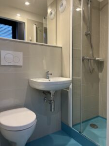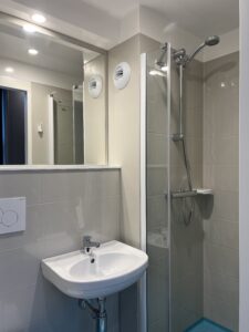- Douche, kranen, douchegordijn en douchevloer met afvoerputje
