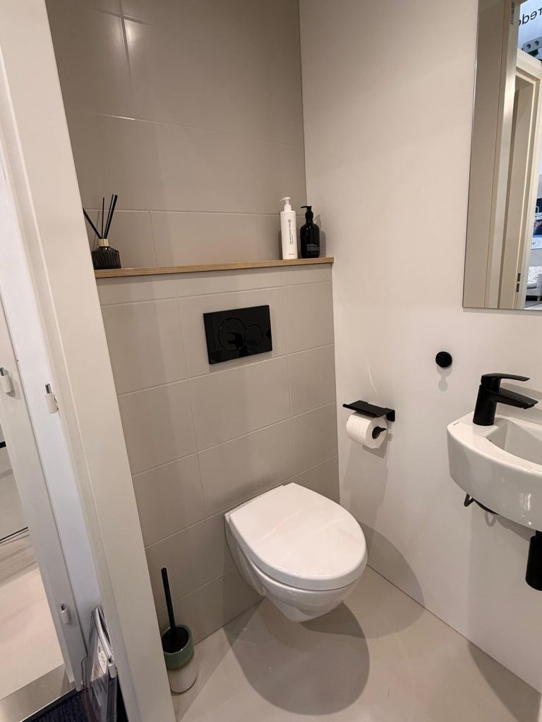 Een efficiënt ingedeelde toiletruimte die optimaal gebruikmaakt van minimale vierkante meters.